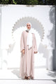 Elevate your modest fashion collection with this timeless classic abaya, distinguished by refined striped detailing across the upper bodice. The piece features luxurious golden zippers and button accents that add sophisticated dimension to the traditional silhouette. Crafted for everyday elegance and special occasions alike, this abaya drapes gracefully while maintaining its structured form. Each purchase includes a coordinating scarf, ensuring a complete, polished look. Perfect for those who appreciate quality construction and understated luxury in their modest wear wardrobe.