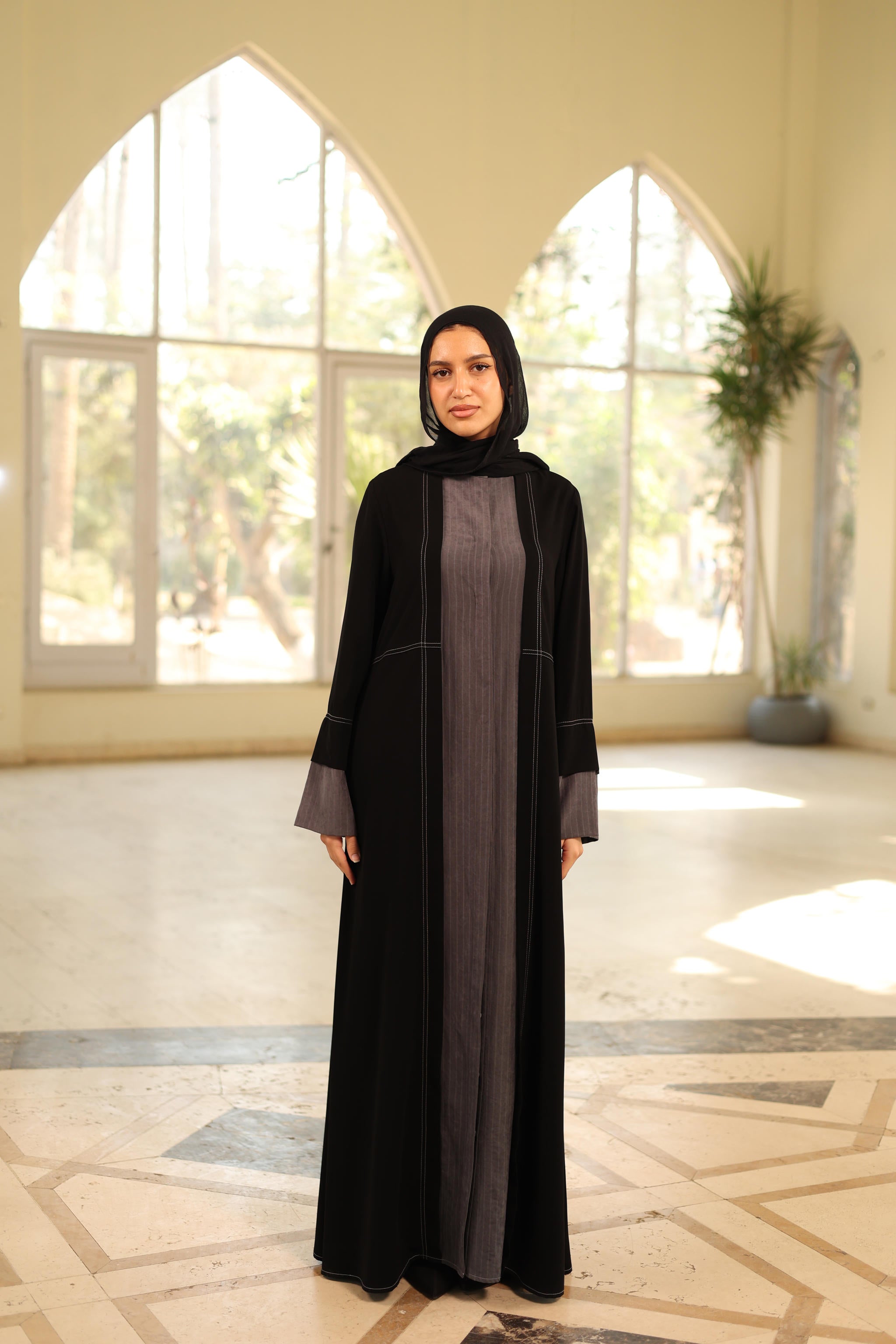 Elegant dual fabric abaya shirt in sophisticated grey. Combines flowing traditional silhouette with modern design elements. The mixed fabric construction offers both comfort and structure, perfect for everyday wear or special occasions. Versatile piece that transitions seamlessly through your wardrobe.