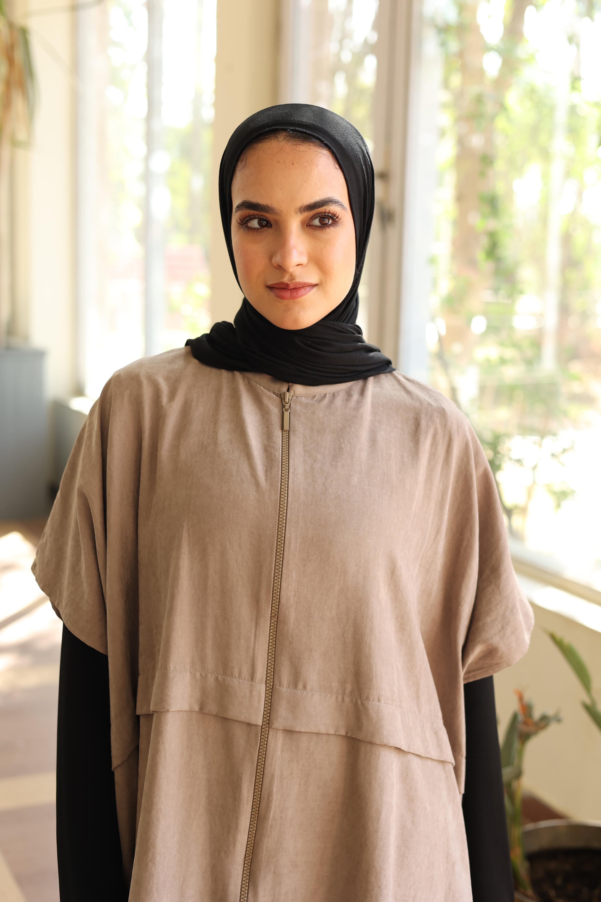 Elevate your everyday style with this sophisticated front-zip cape in rich café tones. The sleek zip closure adds modern convenience while the flowing silhouette creates an effortlessly chic layering piece. Perfect for transitional seasons, this versatile cape pairs beautifully with abayas or casual wear for an instantly polished look.
