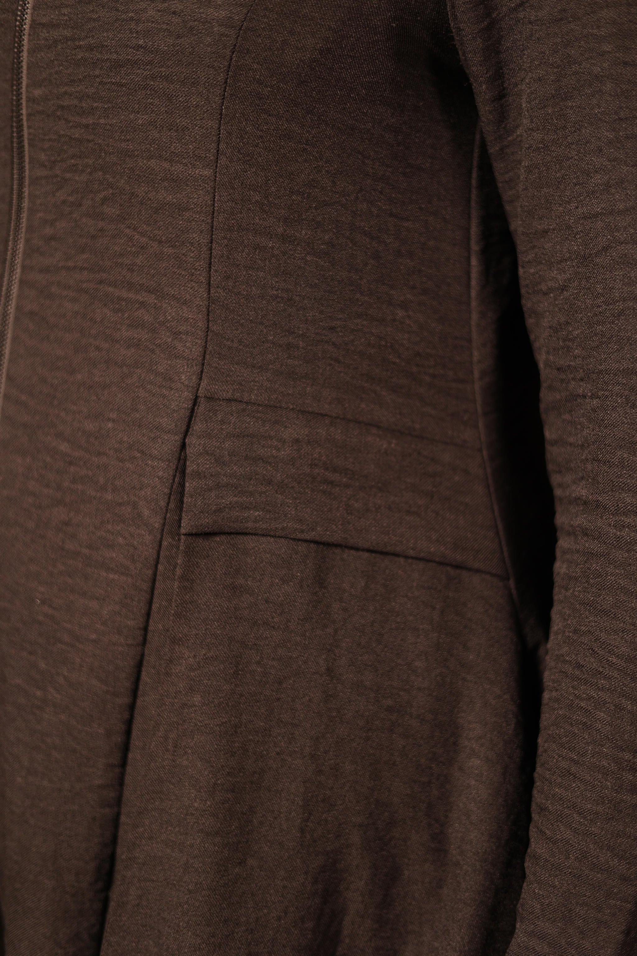 High-low blouse with front zipper in classic black. The asymmetrical hemline creates a modern silhouette, while the functional zipper adds versatility for layering or adjusting fit. Perfect for casual wear or dressing up with tailored pieces.