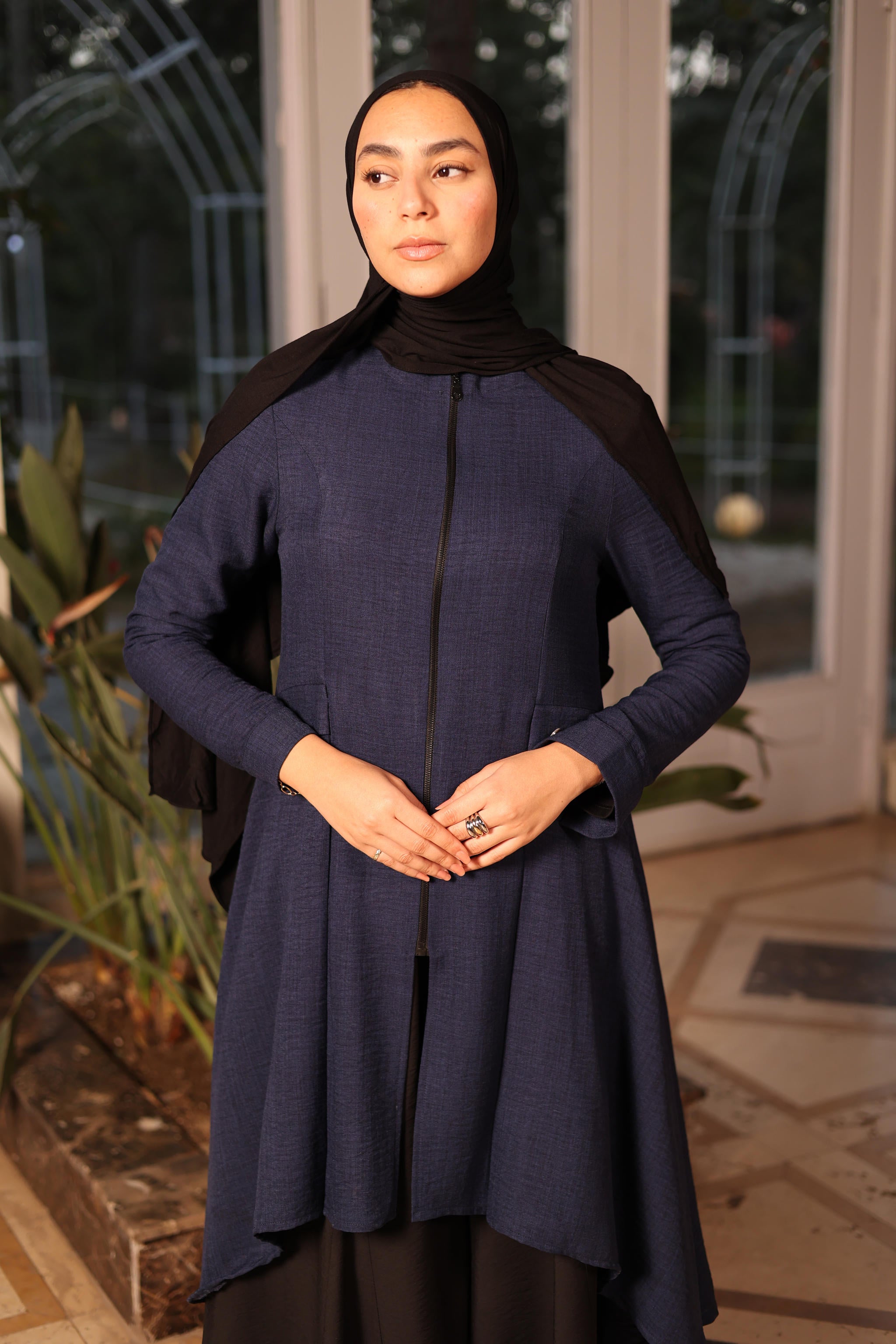 High-low blouse in navy with a functional front zipper. The asymmetrical hemline creates a modern silhouette, while the zipper adds versatility for layering and styling. Perfect for casual wear or dressing up with tailored pieces.