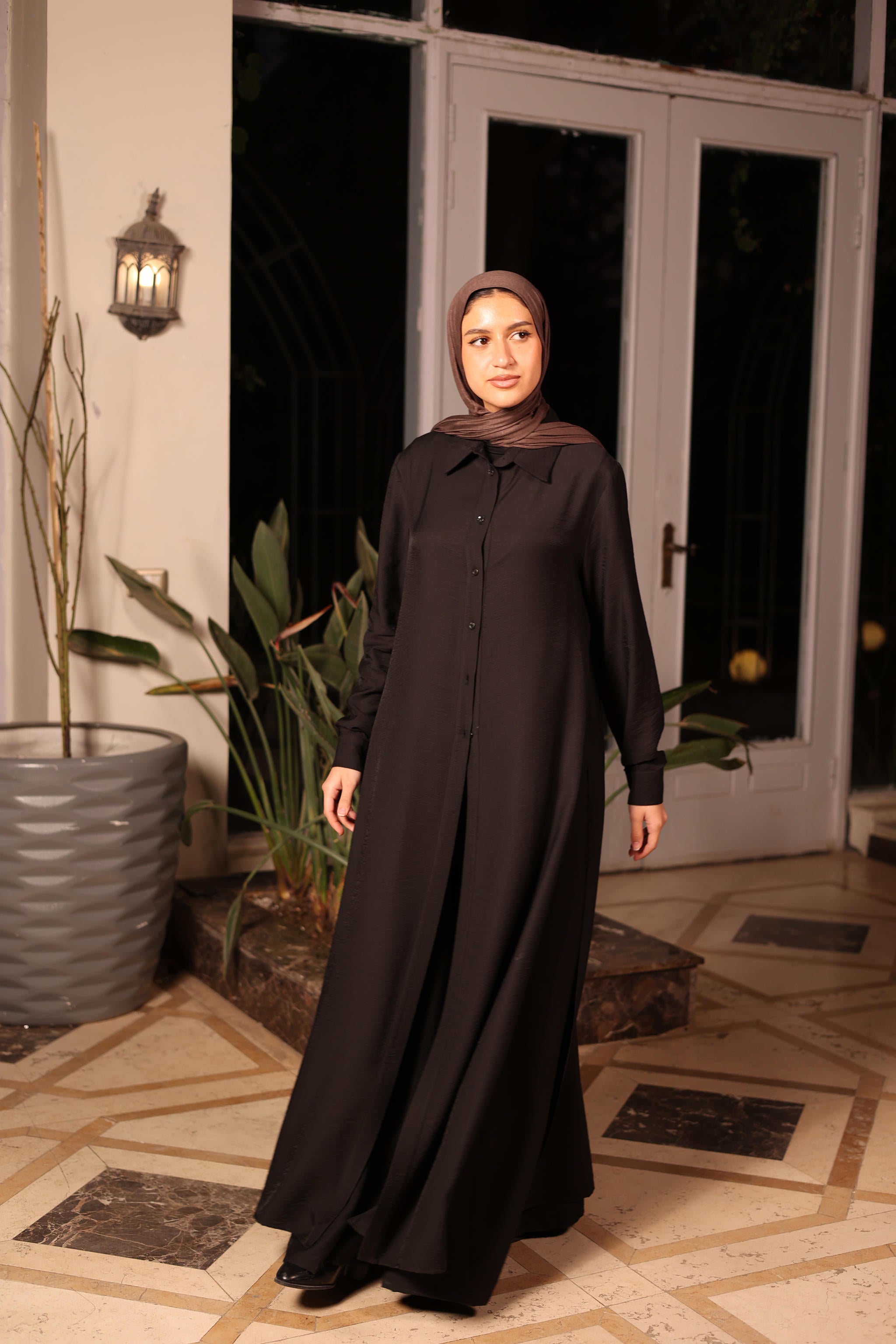 Elegant black long shirt featuring a striking high slit design for modern movement and style. Crafted from quality fabric, this versatile piece transitions seamlessly from casual to formal occasions. The flowing silhouette and dramatic slit detail create a sophisticated look that flatters various body types. Perfect for layering or wearing as a statement piece.