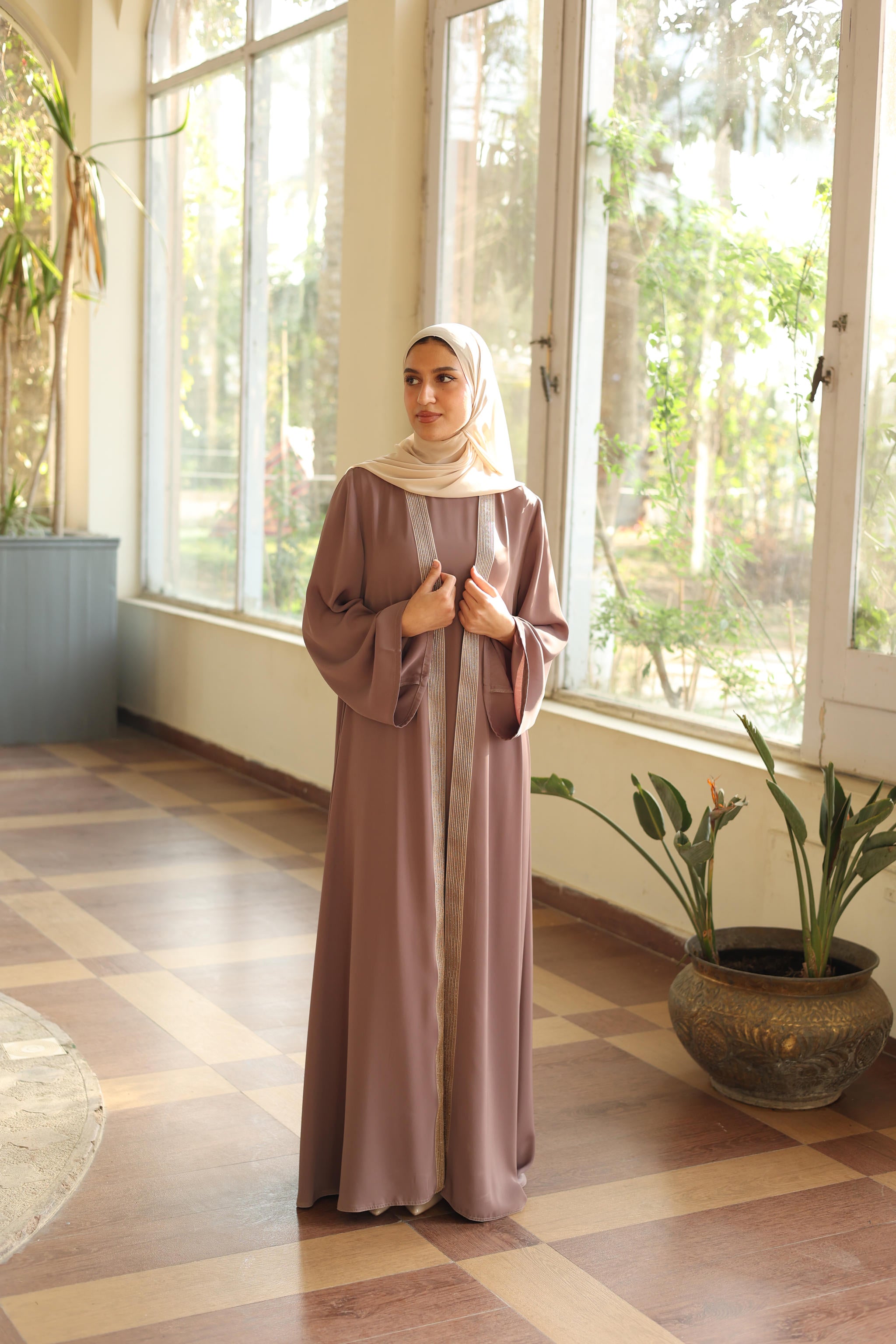 Shine Trim Abaya Set cafe