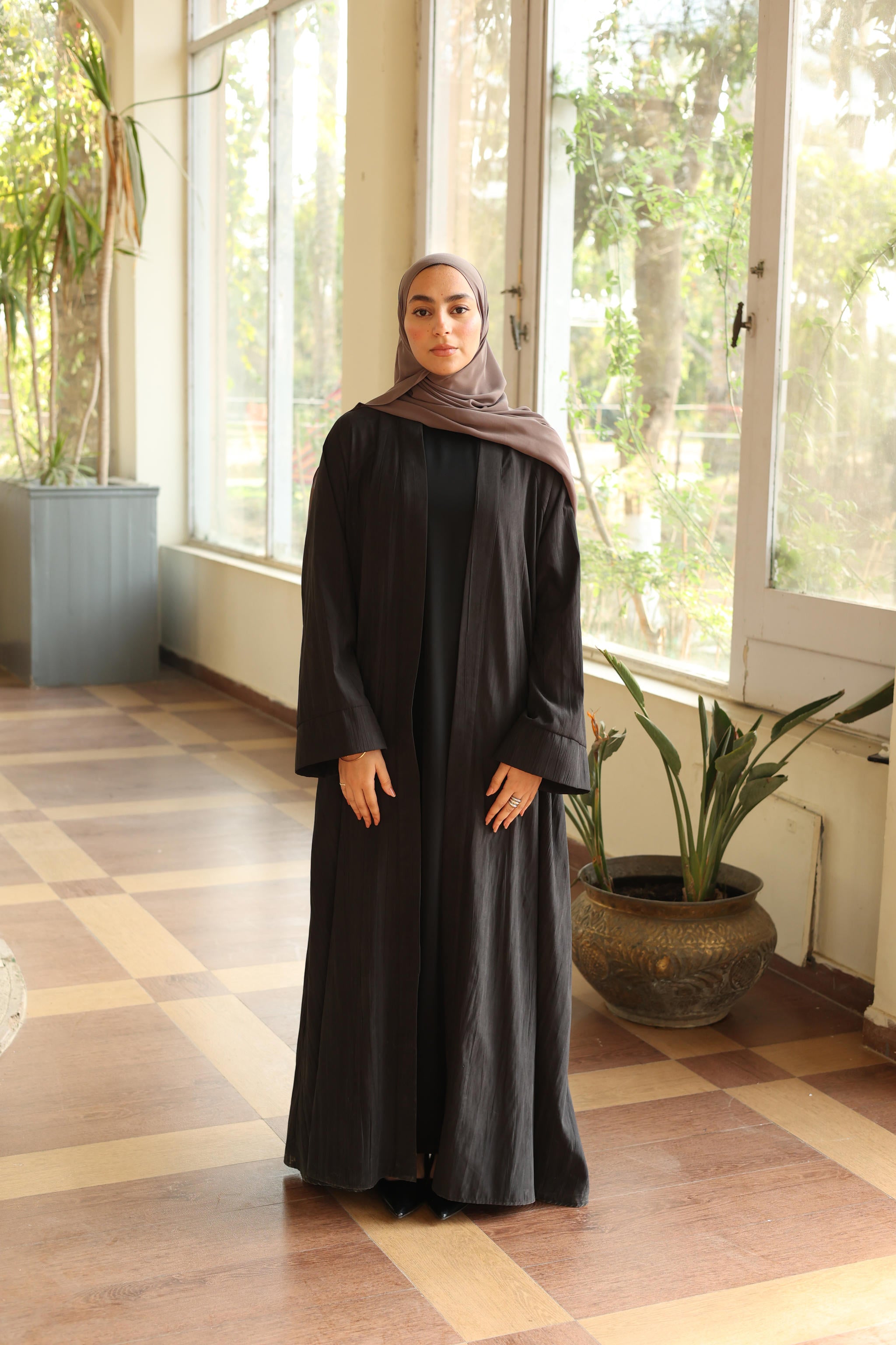 Elegant black abaya crafted from soft, crushed fabric that drapes beautifully. The delicate texture adds subtle dimension while maintaining a modest, timeless silhouette. Perfect for everyday wear or special occasions, this piece combines comfort with sophisticated style.
